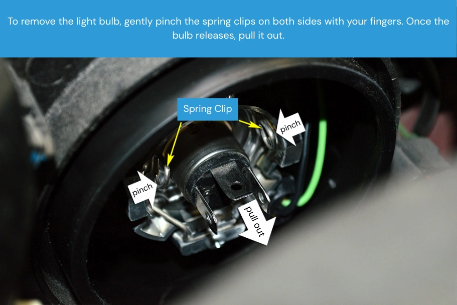 Step 3: Remove the bulb from the housing. The bulb is usually secured by a metal spring clip, and some models may also have a plastic base.