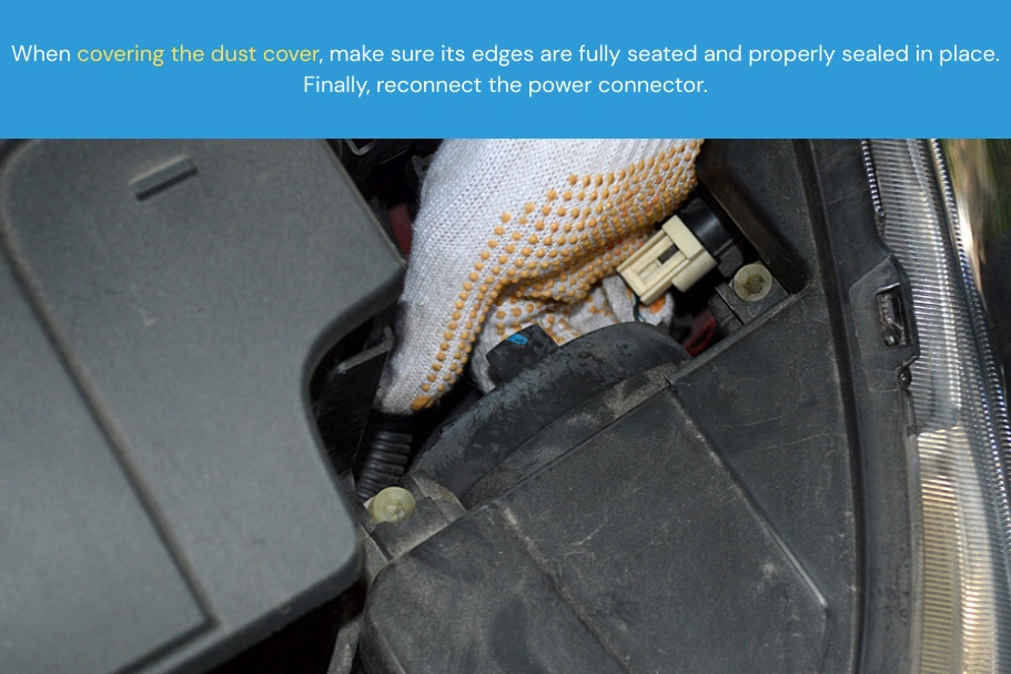 Step 5: Cover the dust cover, reconnect the bulb’s power connector. The replacement process is now complete.