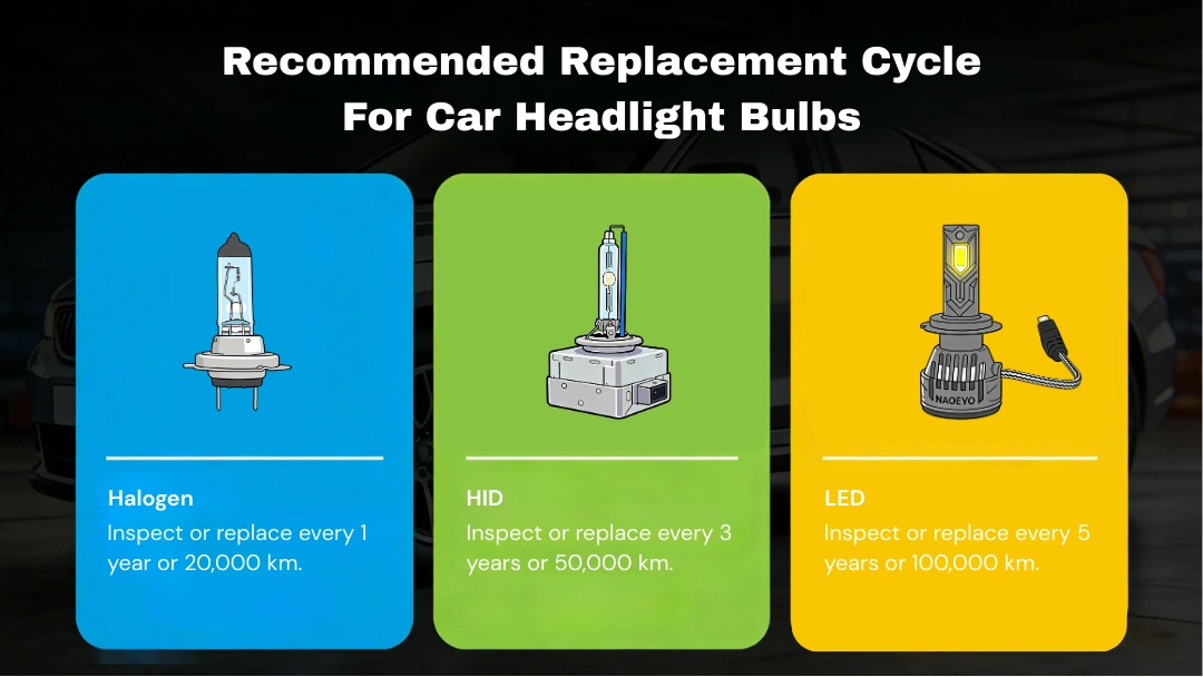 For example, halogen bulbs are generally recommended to be inspected or replaced every 1 year or 20,000 km, HID bulbs every 3 years or 50,000 km, and LED headlights every 5 years or 100,000 km.