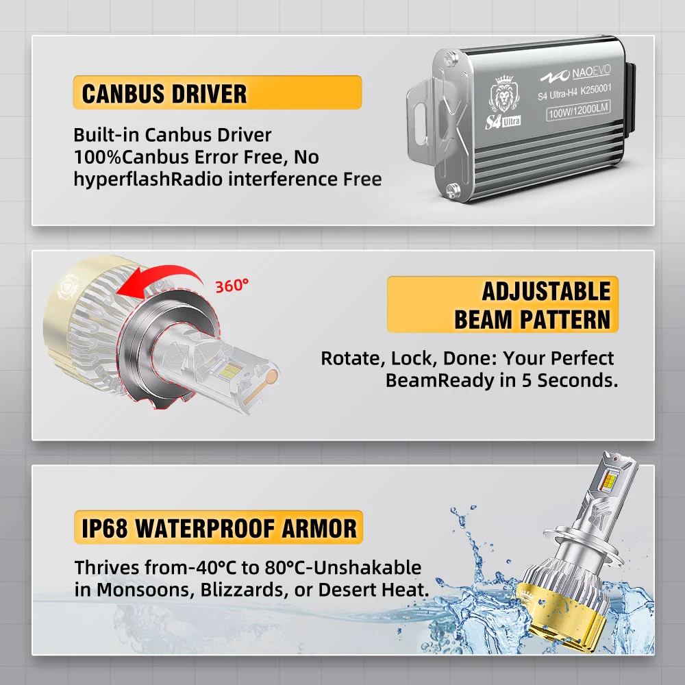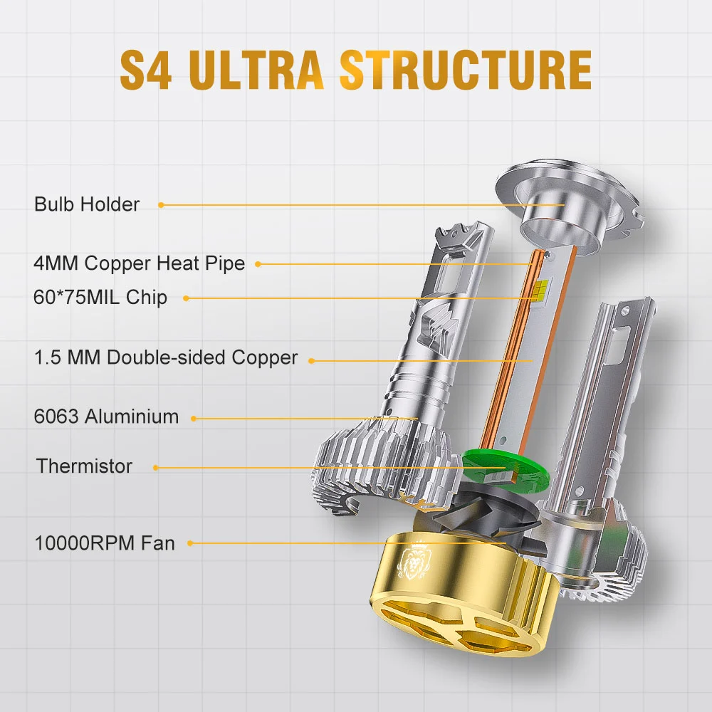 As part of NAOEVO’s premium lineup, the S4 Ultra LED headlight bulbs feature a striking lion-inspired design, symbolizing strength, quality, and leadership. This bold design not only highlights the bulb’s performance but also makes your product lineup truly stand out from the competition, commanding attention and admiration.